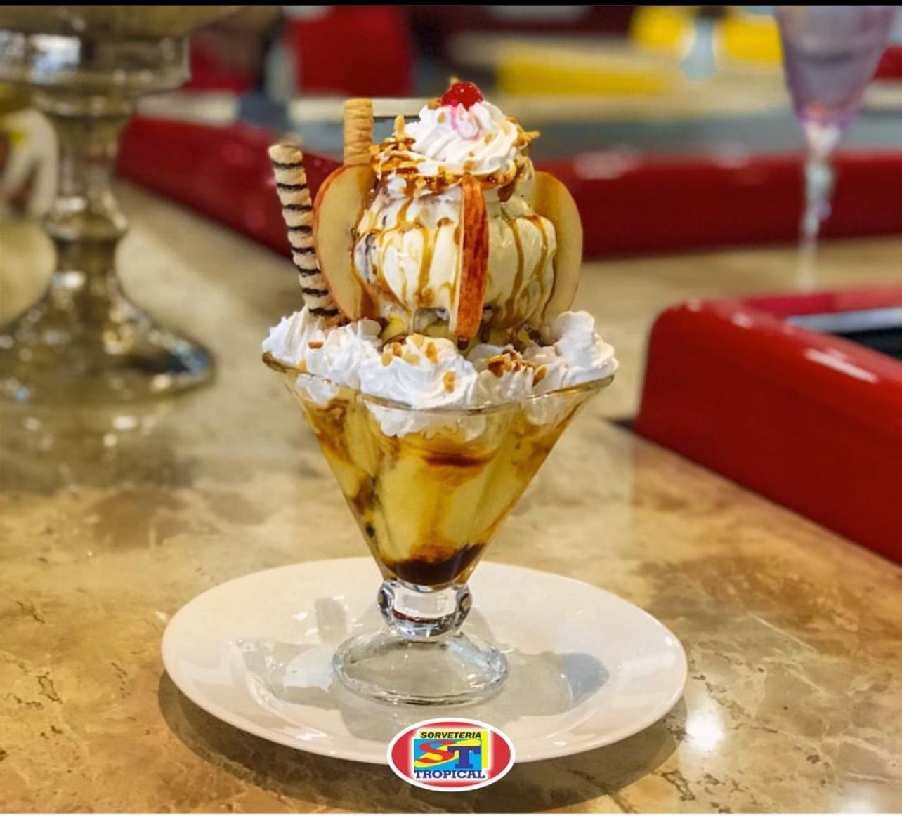 ColegialSorvete, maça, biju, cereja e cobertura.R$ 14,00